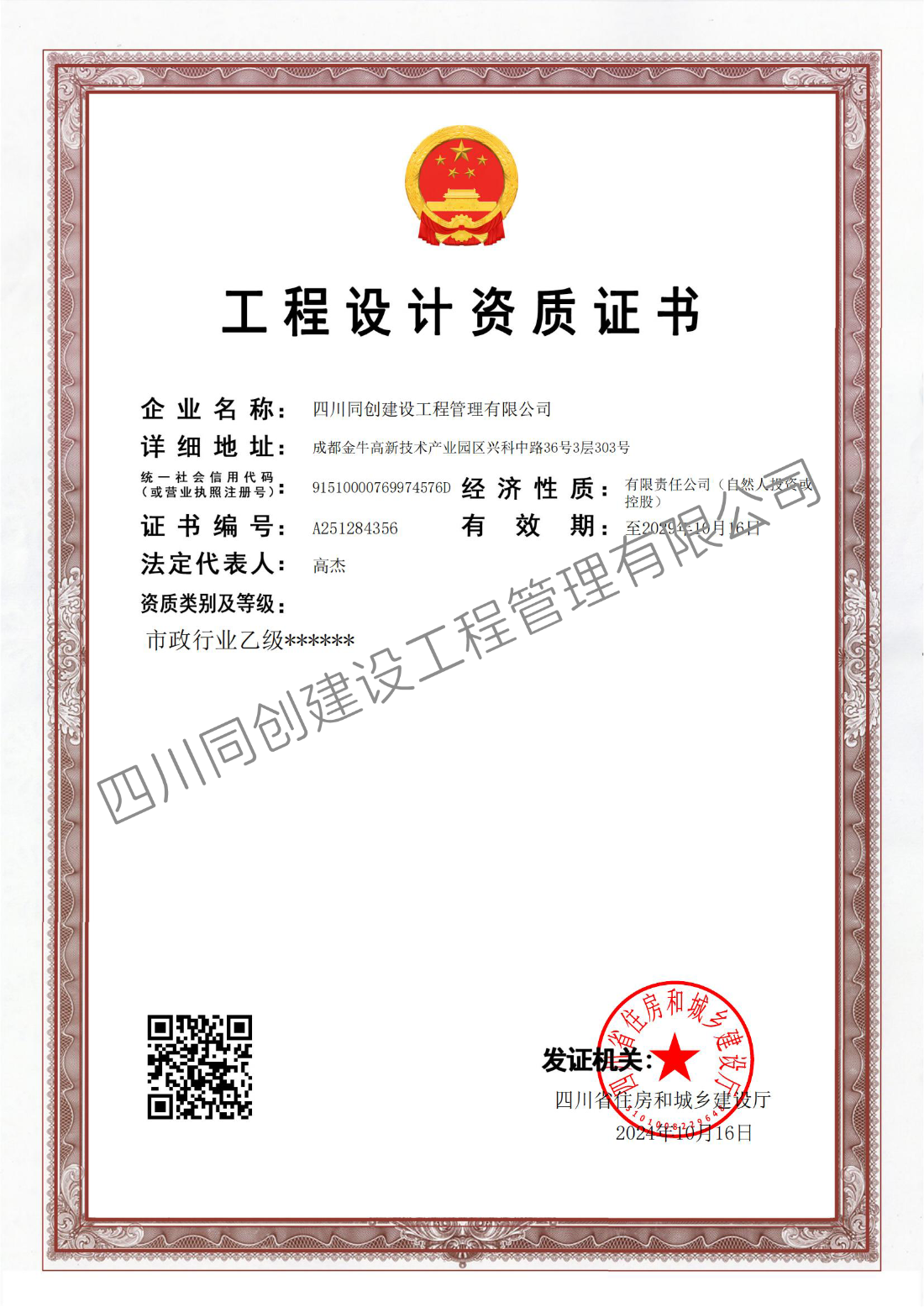 工程设计市政行业乙级资质证书